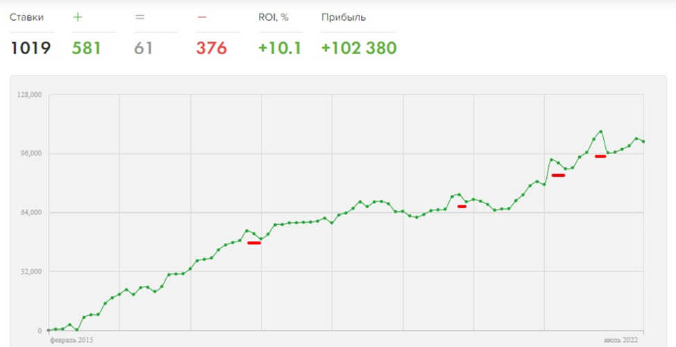 Для меня лузстрик наступает уже после пяти незашедших ставок, потому что я в целом заключаю довольно мало пари, особенно в сравнении с капперами по смолл-маркетам, которые берут объёмами. Если посмотреть на мой график на Legalbet, то за семь лет было минимум четыре значительных падения, но, что приятно, после каждого кривая поползла вверх.