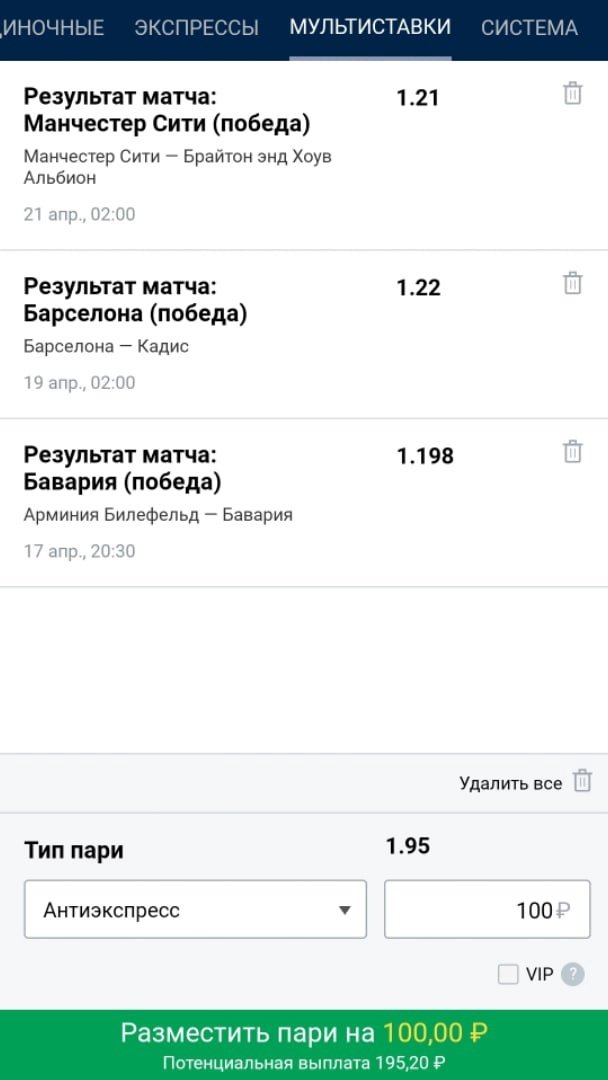 Антиэкспресс с коэффициентом 1.95 в случае ничьей или проигрыша хотя бы одного из фаворитов принесёт нам 950 рублей чистой прибыли. Здесь всё понятно.