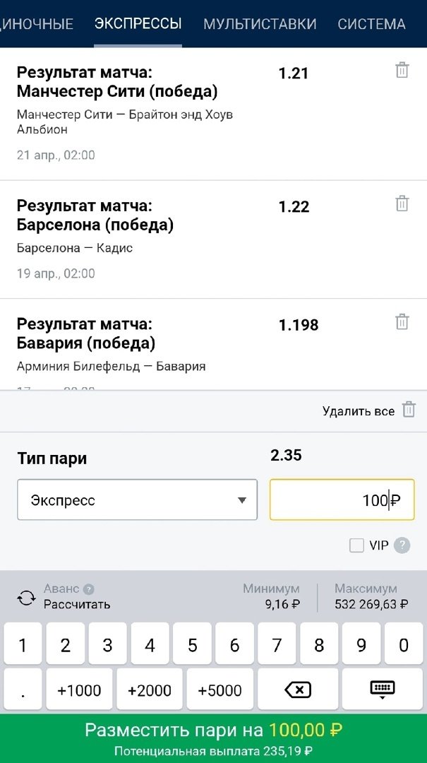 В связи с этим возникает вопрос: а выгодны антиэкспрессы или профитнее распределять флэт на несколько обратных исходов? Проверим на примере того самого купона с «Баварией», «МС» и «Барсой». Размер ставки — 1000 рублей.