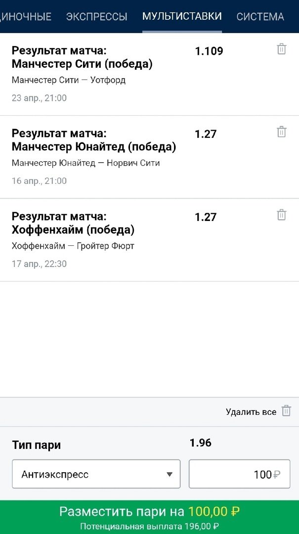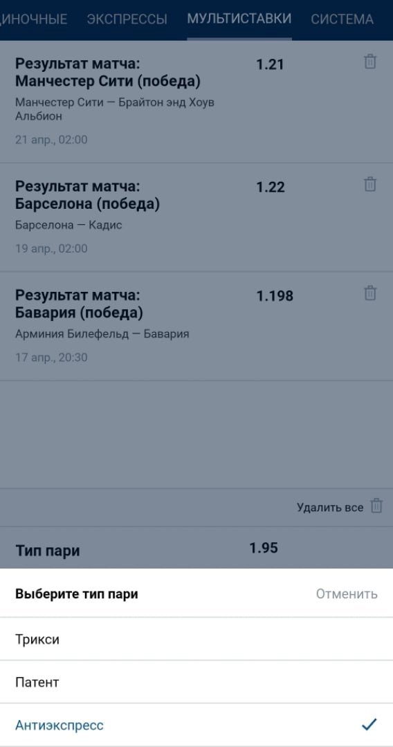 А вот в мобильных приложениях всё не так очевидно: сначала необходимо добавить события, в купоне выбрать меню «мультиставки», а уже там, в выпадающем меню, кликнуть на «антиэкспресс».