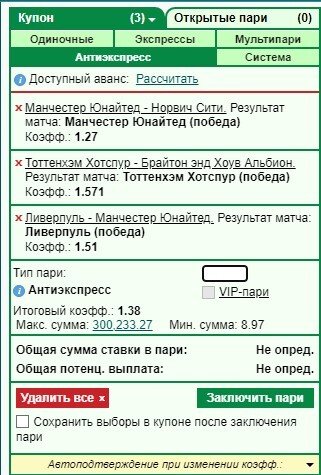 Функционал антиэкспресса достаточно прост: игрок собирает купон из нескольких событий и заключает пари, которое считается выигранным в том случае, если хотя бы один из выбранных исходов не прошёл.