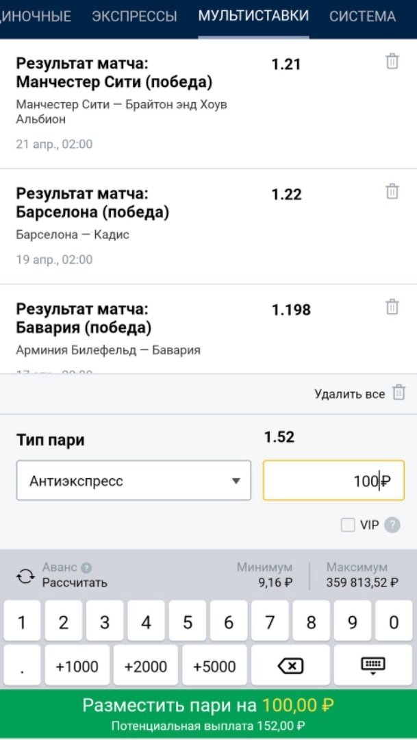 Однако относительно антиэкспрессов это так не работает: например, на экспресс из четырёх событий с кэфом 2.35 дадут поставить больше 500 000 рублей, а на антиэкспресс с теми же событиями и коэффициентом 1.52 — только 359 000.