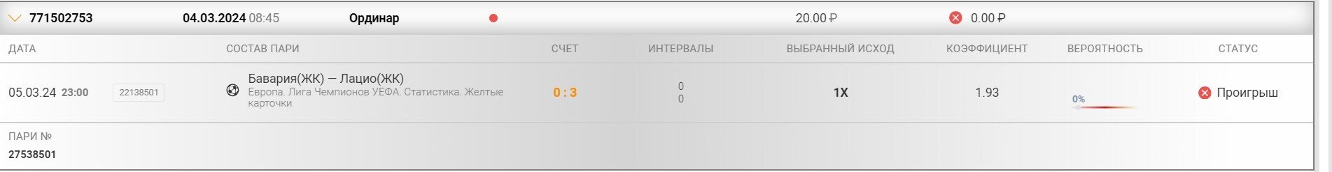 С ординарами ситуация схожая. Очень много низших лиг и дивизионов, где нейросеть пытается угадать победителя пары, а вот на крупные события, например, матчи ЛЧ, она играет статистику — ауты, жёлтые карточки, угловые. За 3 дня не было замечено ни одного предложения пари на исходы в крупных турнирах.