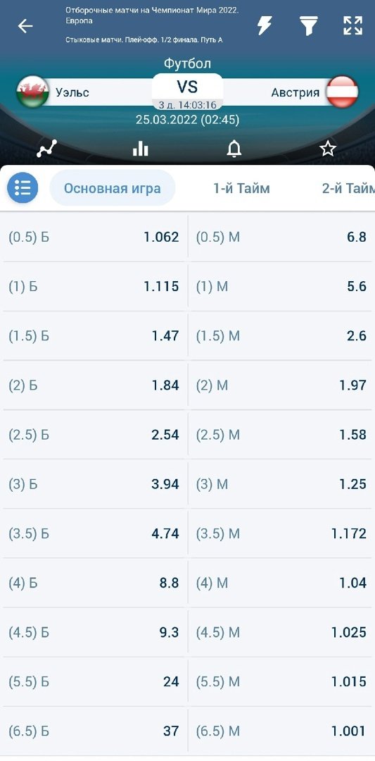 Беттор собирается ставить на ТБ 2,5 в матчах Уэльса, который как раз совсем скоро встретится в квалификации к чемпионату мира-2022 с Австрией. Коэффициент на выбранный исход в предстоящем матче 2.54, то есть вероятность его свершения составляет около 39%, а поставить игрок планирует 1000 рублей.
