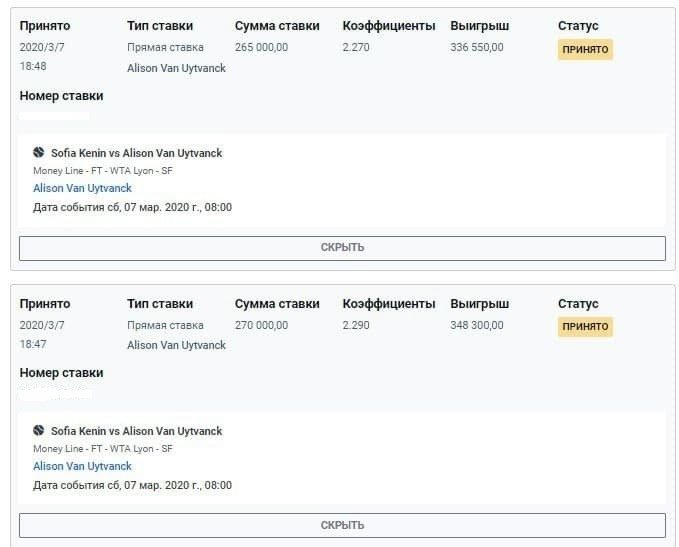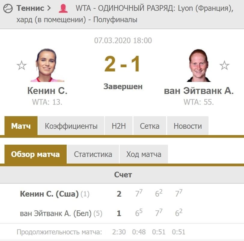 В один момент дело у нас снова дошло до седьмого шага, сумма ставки уже более чем солидная — чуть больше 500 000 рублей. Моим предложением было снова сыграть накатом на два события с меньшими коэффициентами, но партнёр настоял на классическом подходе. В итоге поставили на победу Алисон Ван Эйтванк в полуфинале турнира WTA во Франции. Играла она против Софии Кенин.