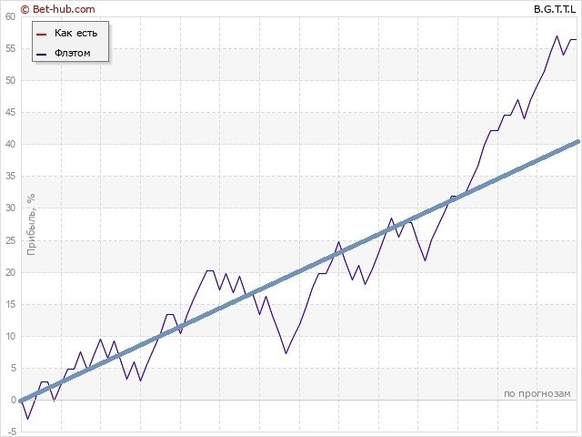 Для примера предлагаем график прогнозов профессионального каппера Владимира Светлицы на площадке Bet-Hub за последние 250% оборота: синяя полоса — примерное среднее математическое ожидание от его прогнозов, но по графику видно, что периодически случаются отклонения как в сторону плюса, так и в отрицательном направлении.
