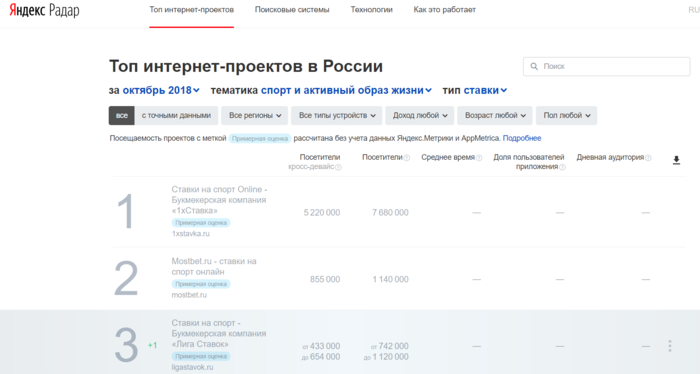 Букмекерская контора (веб-сайт) | Количество посещений на октябрь 2018 года |
