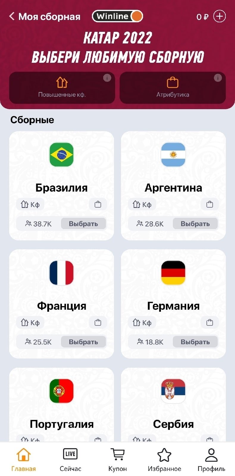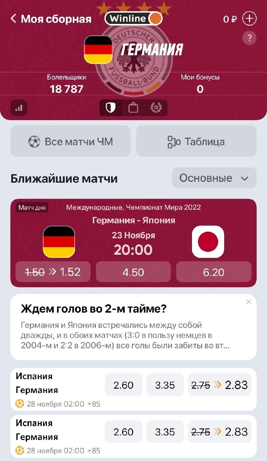 Winline к чемпионату мира адаптировал свою акцию «Мой клуб» — игроки могут выбрать любимую сборную и ставить на неё с повышенными коэффициентами. Плюс обещают повышенную скорость приёма пари, поэтому любителям лайв-ставок стоит присмотреться.