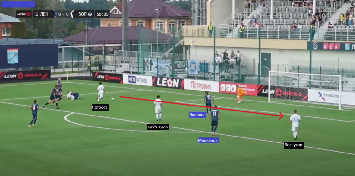 Полнейший провал в своей штрафной, где находится один лишь Яковлев. Погосов получает мяч и может отдать хоть на Бахтиярова, хоть покатить дальше на Лоскутова. Форвард «Волгаря» выбирает второй вариант и отдаёт на 56-го номера, которого вообще никто не держит. В этой ситуации закрывать дальнюю штангу должен был Маркелов, но он слишком поздно понял, что оставил неприкрытым соперника в нескольких метрах от своих ворот. Повезло и Ивану, и всему «Ленинградцу» — Лоскутов исполнил Тимо Вернера, угодив в штангу.