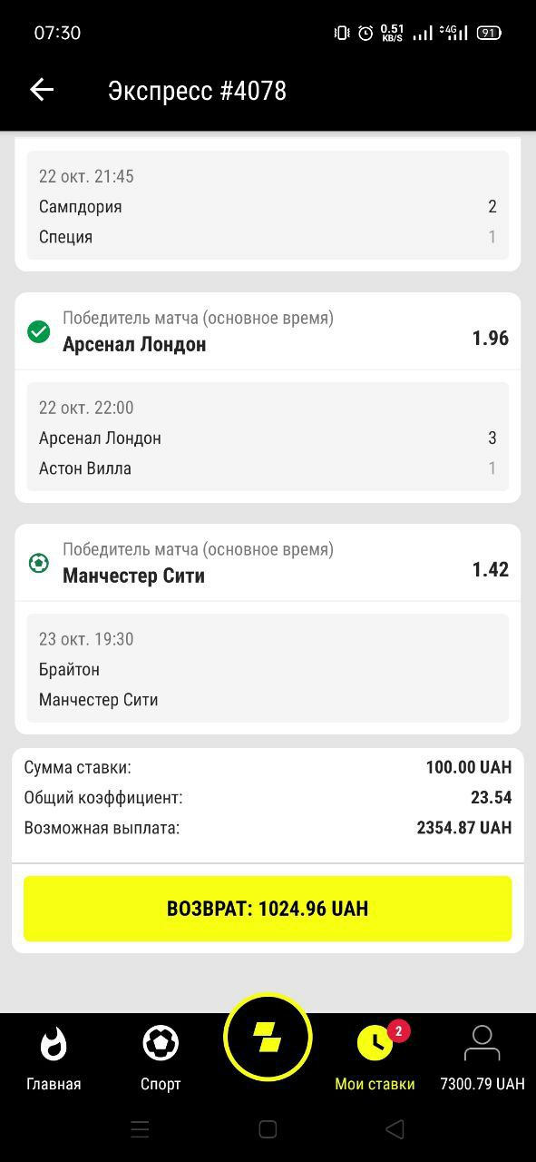 Разберём конкретный пример. Перед вами экспресс одного из моих подписчиков из Украины, которым он похвастался, когда оставалось всего лишь одно событие. Ставка — 100 гривен, возможный выигрыш — 2354, досрочная выплата — 1024, а для полного захода нужна только победа «Манчестер Сити» за кэф 1.42.