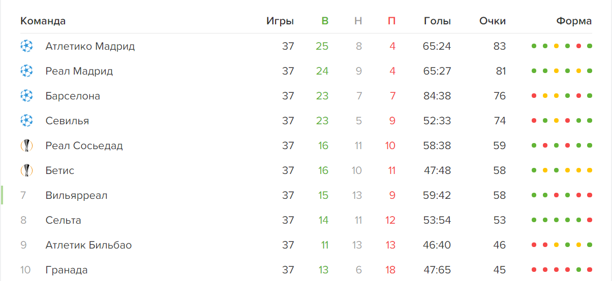«Реал» не опустится ниже второго места, но может стать чемпионом. Для этого мадридцам нужно победить в заключительном туре и рассчитывать на то, что «Атлетико» не выиграет у «Вальядолида» в гостях. При таком раскладе команда Зинедина Зидана как минимум сравняется по очкам с конкурентом и окажется выше за счёт личных встреч.