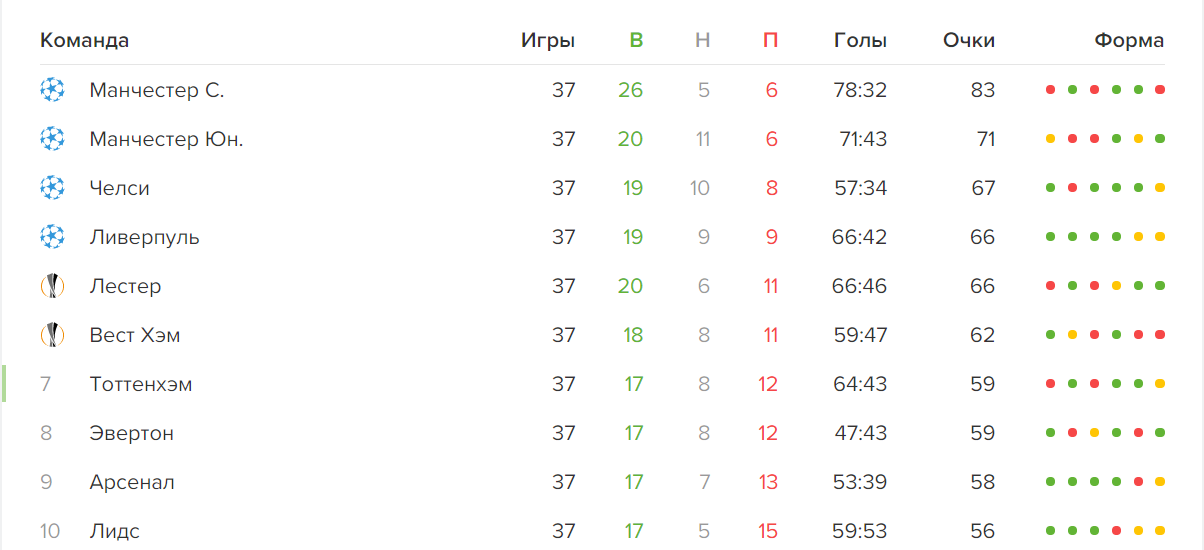 «Ливерпуль» – 66 очков, разница голов +24, количество забитых мячей – 66;