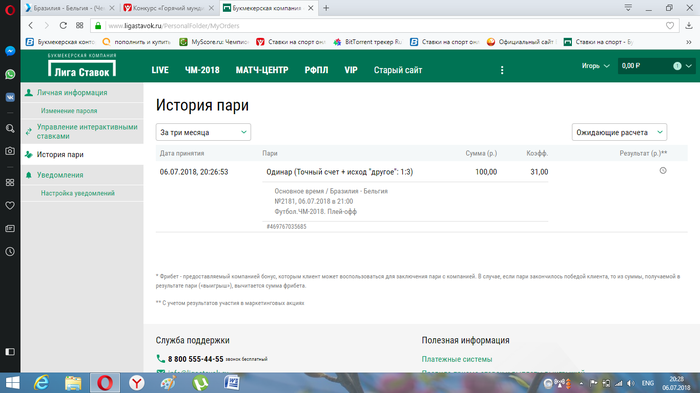 На любой матч игрового дня необходимо сделать реальную ставку на сайте www.ligastavok.ru. Скриншот этой ставки нужно разместить в комментариях к конкурсному посту игрового дня не позднее чем через час после заключения пари. Скриншот может быть принят исключительно до начала матча, на который сделана ставка.