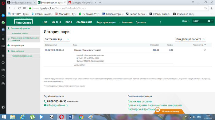 На любой матч игрового дня необходимо сделать реальную ставку на сайте www.ligastavok.ru. Скриншот этой ставки нужно разместить в комментариях к конкурсному посту игрового дня не позднее чем через час после заключения пари. Скриншот может быть принят исключительно до начала матча, на который сделана ставка.