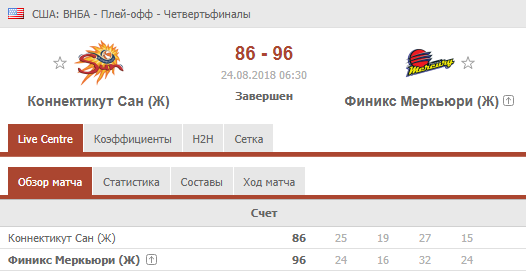 Коннектикут Сан как все знают, пропустили первый раунд плей-офф из-за наиболее высокого места в турнирной таблице в регулярном сезоне. Их же соперник из Финикса будет играть уже второй матч в этом розыгрыше плей-офф. В первой игре баскетболистки из Меркури уверено переиграли на родной арене игроков Даллас Уингс со счетом 101:83.