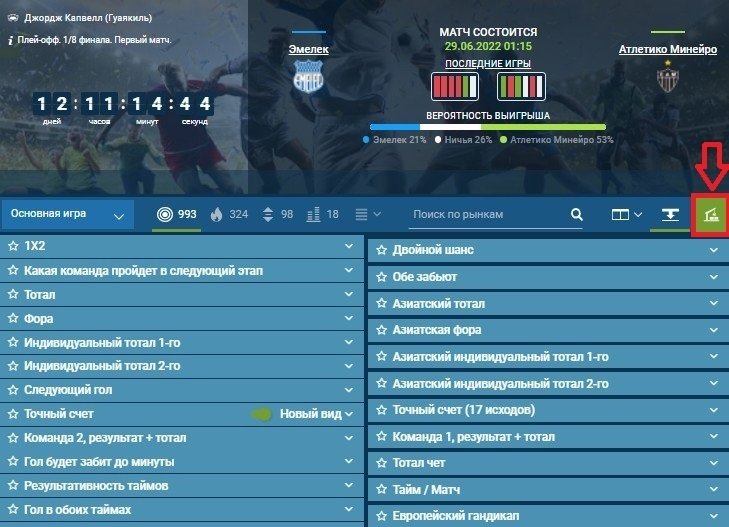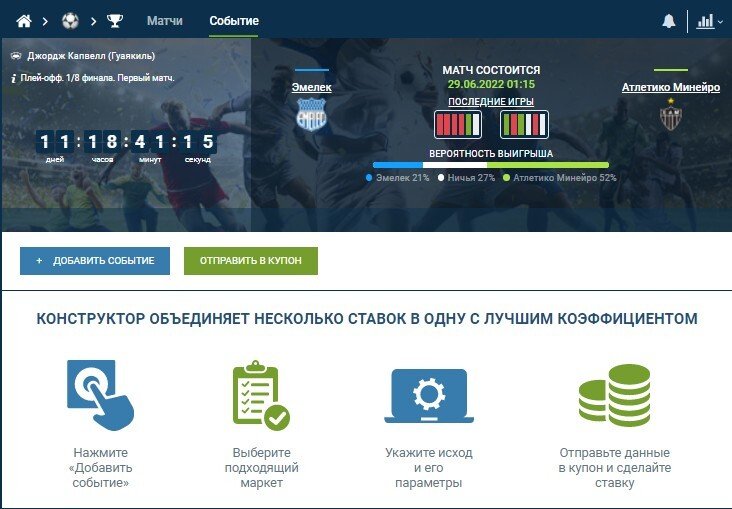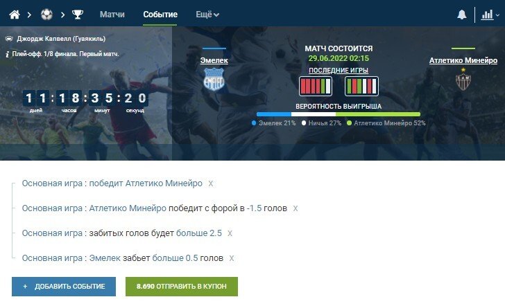 Самый сок заключается в возможности скомбинировать не два исхода, как в стандартной комбинированной ставке, а больше. В купон можно добавить, например, победу «Атлетико Минейро», фору «Атлетико» (-1,5), тотал матча больше 2,5 и индивидуальный тотал «Эмелека» больше 1,5.