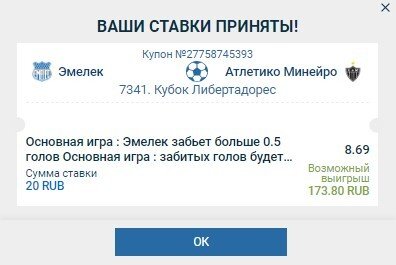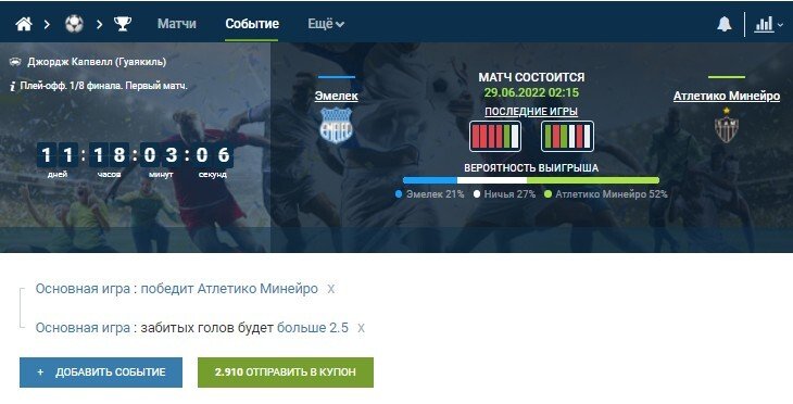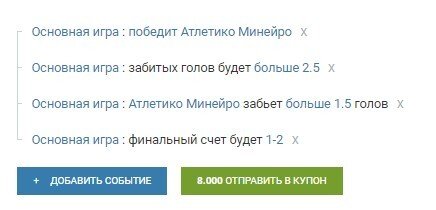 Важно, чтобы события не перекрывали друг друга. Например, если вы возьмёте победу «Атлетико», тотал матча больше 2,5, тотал «Атлетико» больше 1,5 и точный счёт 2:1 в пользу «Минейро», то последний исход перекроет остальные, так как подразумевает их все. Итоговый кэф купона в итоге будет равен котировкам на точный счёт.