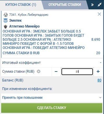 Это видно на примере пари с четырьмя исходами: на победу бразильского «Атлетико» БК даёт 1.83, на его фору (-1,5) — 3.20, на ТБ 2,5 — 2.02 и на ИТ «Эмелека» — 1.57. Победа «Минейро» и фора (-1,5) — это пересекающиеся исходы, поэтому в расчёт купона пошёл только кэф 3.20.