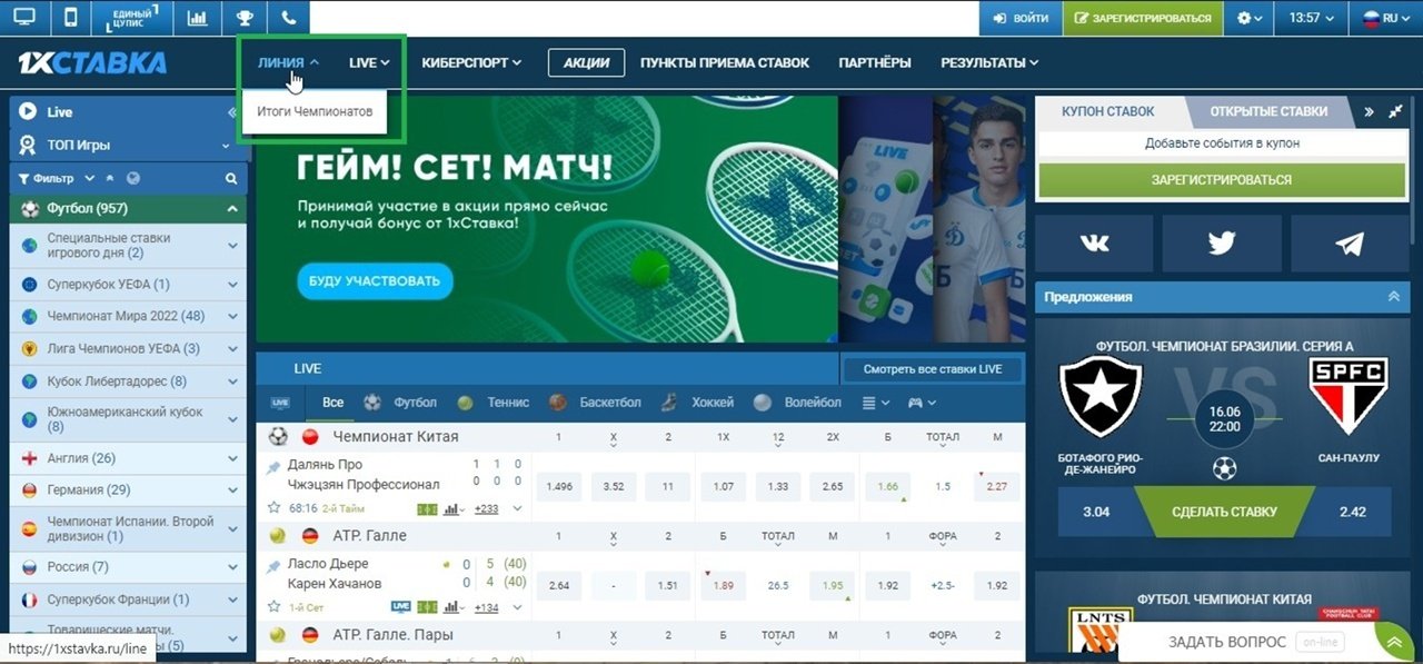 Поэтому если игрок решил подкрепить исход тоталом, то лучше порыться в линии — это банально быстрее, чем копаться в конструкторе. А необходимый исход 100% будет: конструктор доступен только для крупных соревнований, роспись на которые в «1хСтавке» топовые.