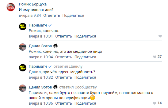 К сожалению, пресс-служба «Париматч» отказалась от комментариев, сославшись на закон о защите персональных данных. Это объясняет, почему «ПМ» раскручивал историю через классическое «фанат сорвал куш», не назвав имя счастливчика. То, что может Антон Черепенников, не может «Париматч».