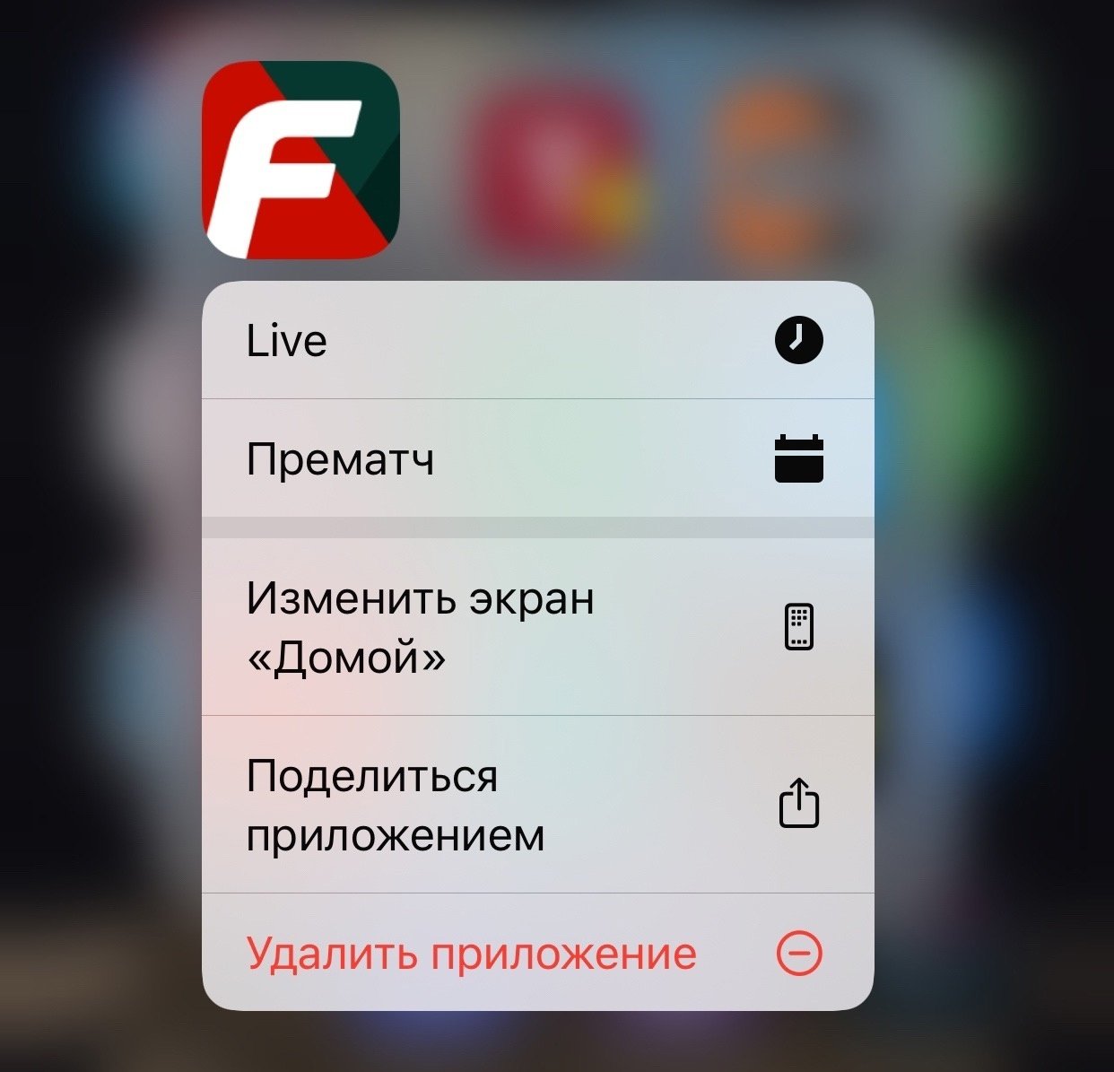 Все конторы по умолчанию показывают клиенту сначала главную страницу, на которой собраны топовые события дня в прематче и/или лайве. Но есть вариант обойтись без лишних действий, если попасть нужно сразу в разделы Live или «Прематч». Правда сработает это только в приложениях на iOS, и только в Fonbet и PARI. Нужно зажать иконку букмекера, и, помимо предложения удалить программу или поделиться ей, выскочат ещё и кнопки навигации.