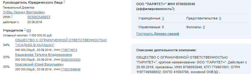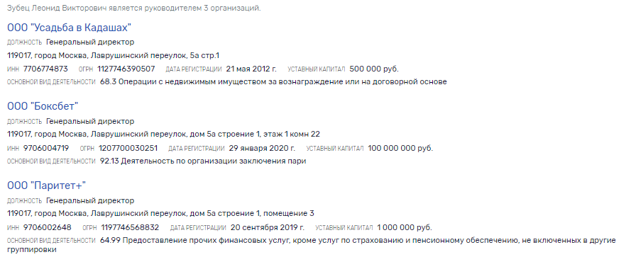 Последняя организация тоже фигурирует здесь неспроста. Во-первых, она является учредителем «Спортивных лотерей». Во-вторых, её генеральный директор Леонид Зубец одновременно занимает аналогичную должность в ООО «Усадьба в Кадашах» и ООО «Боксбет». Все три компании имеют один и тот же московский адрес.