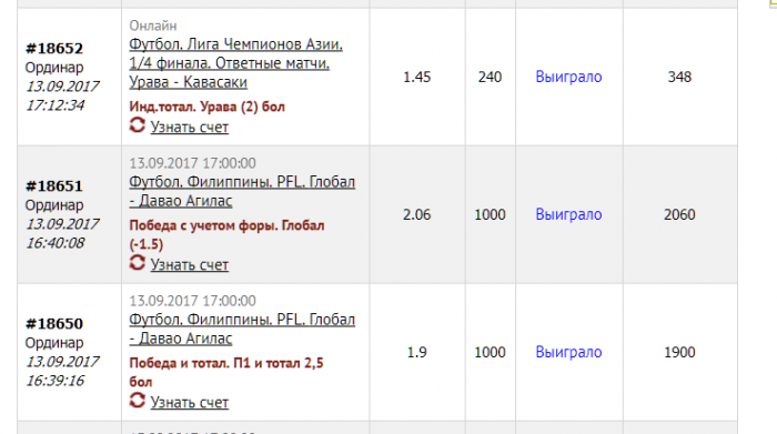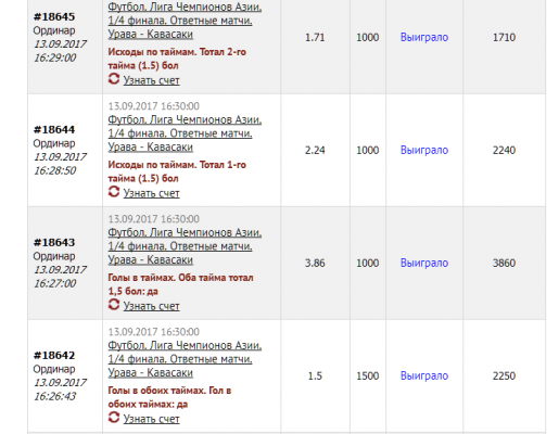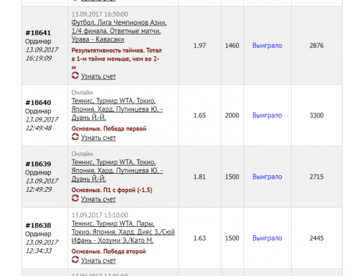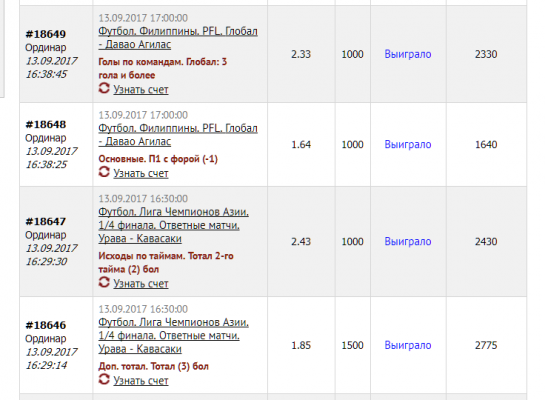 - Профит высчитан по расчету одна ставка - 1000 рублей.