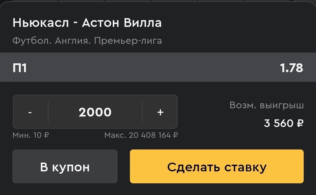 Чтобы быть максимально объективными в оценках, размер лимитов будем проверять у одних и тех же событий: П1 и ТМ 2,5 в матче квалификации Лиги чемпионов «Астана» — «Динамо Тбилиси» и П1 и ТБ 2,5 в игре 1-го тура АПЛ-2023/24 между «Ньюкаслом» и «Астон Виллой».