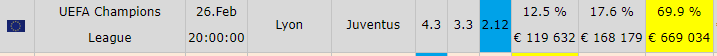 В самом начале прогноза я уже познакомил вас с котировкой на победу «Ювентуса», однако, умолчал, что букмекерские линии движутся в пользу «Лиона». Коэффициент на то, что французы не проиграют (1Х) упал с 2.18 до 1.98 в росписи «Леона». Не так существенно, но факт.