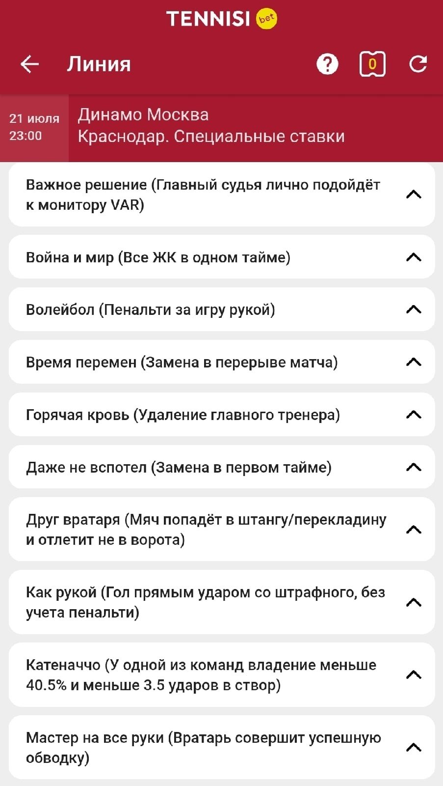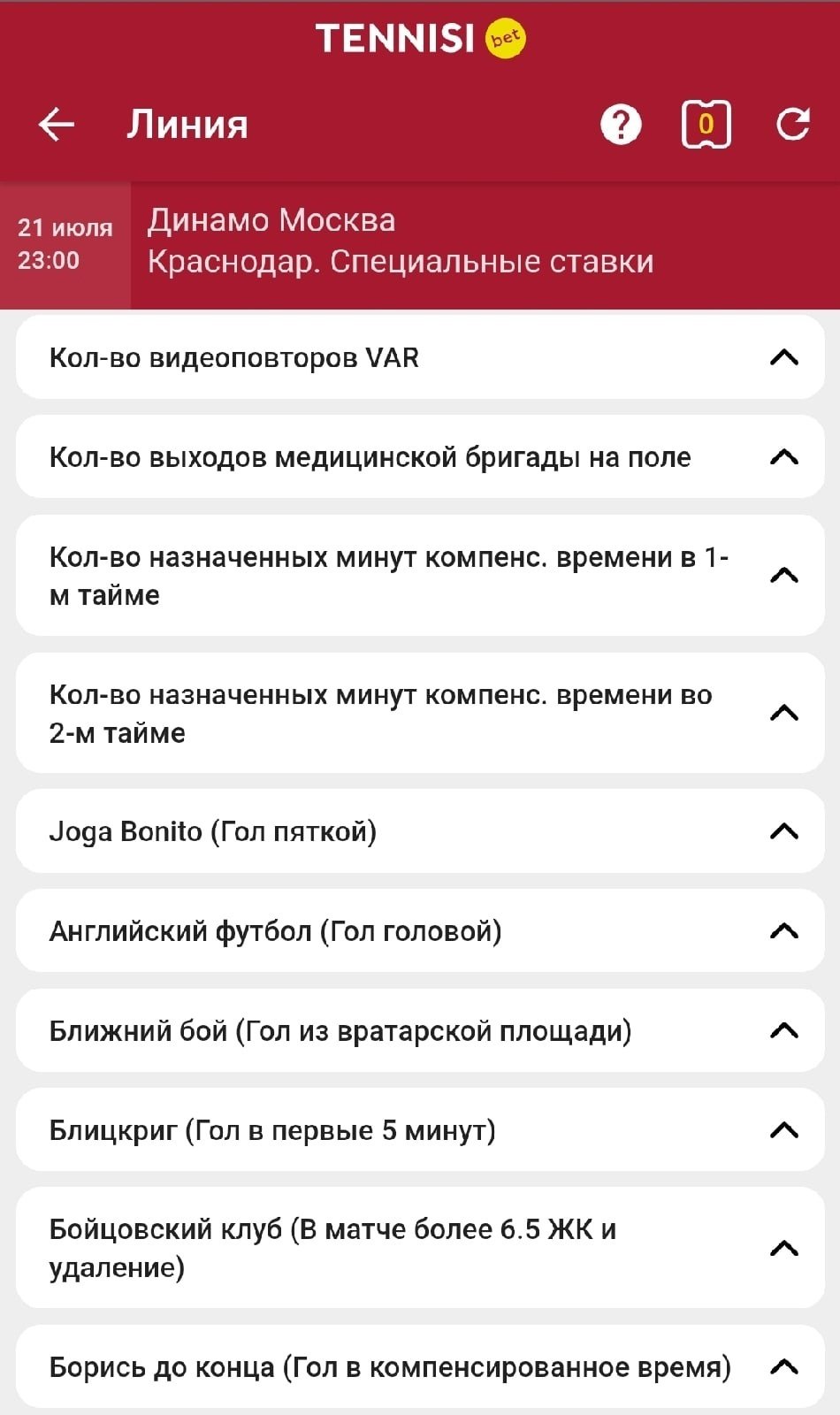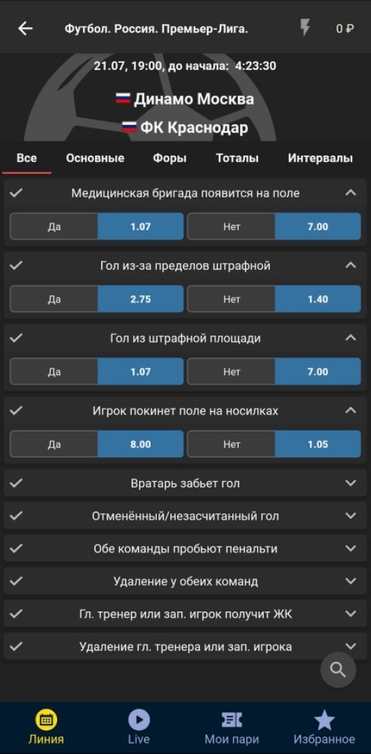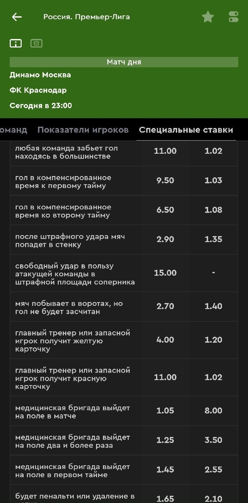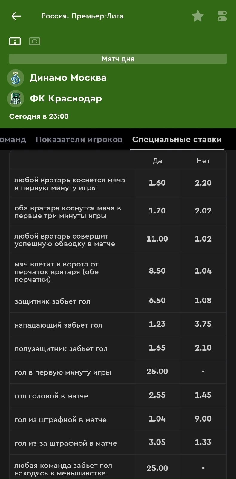В разделе «Специальное» можно найти достаточно интересных вариантов, вроде касания мяча голкипером на 1-й минуте встречи. Лимиты на эти рынки что-то между мидлами и смолами — дадут поставить около 100 тысяч рублей.