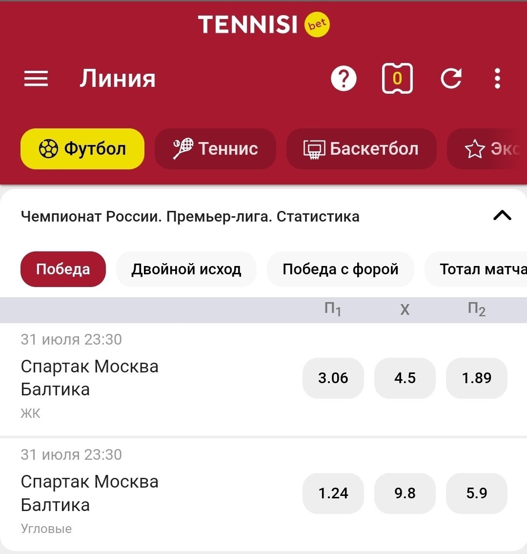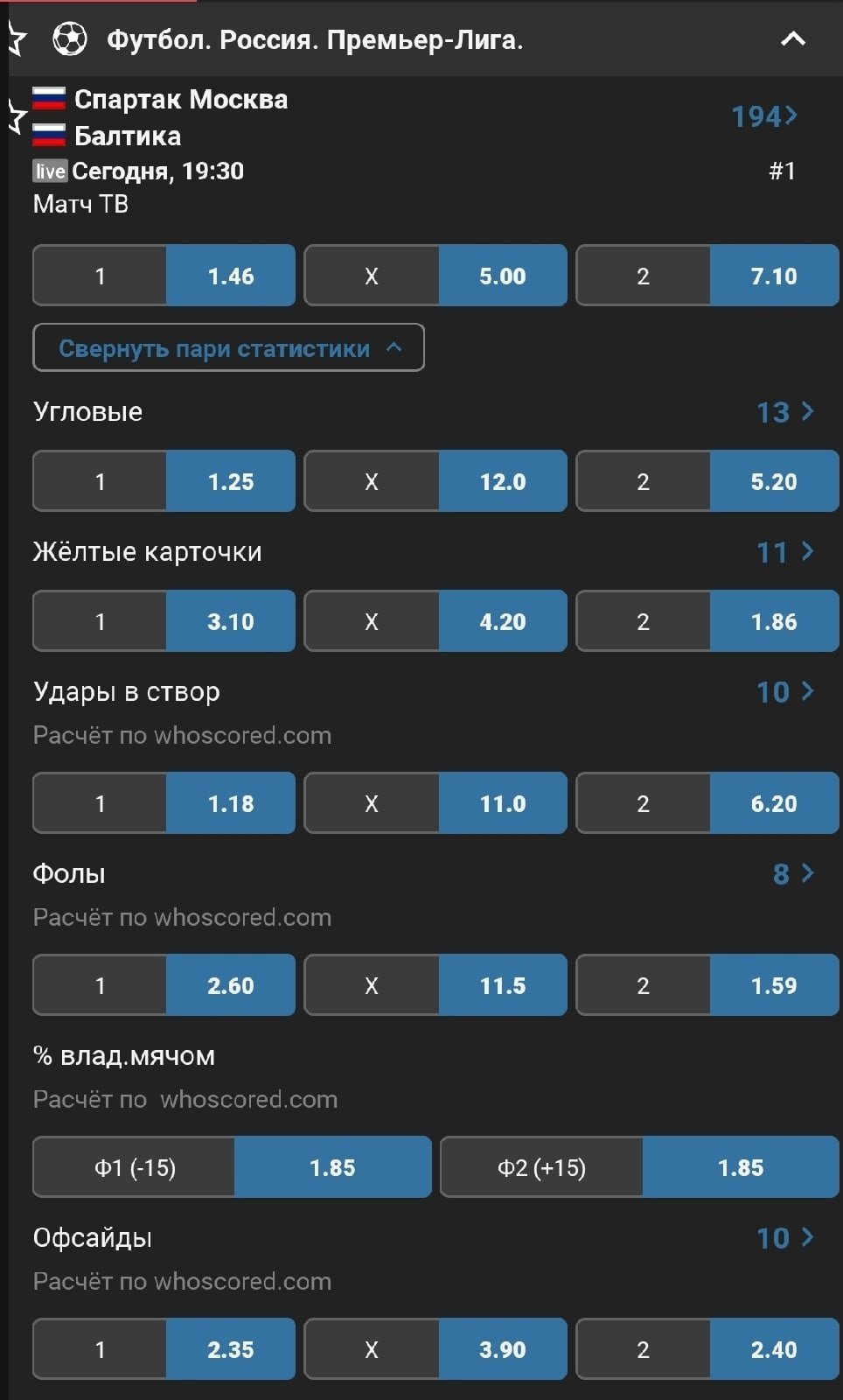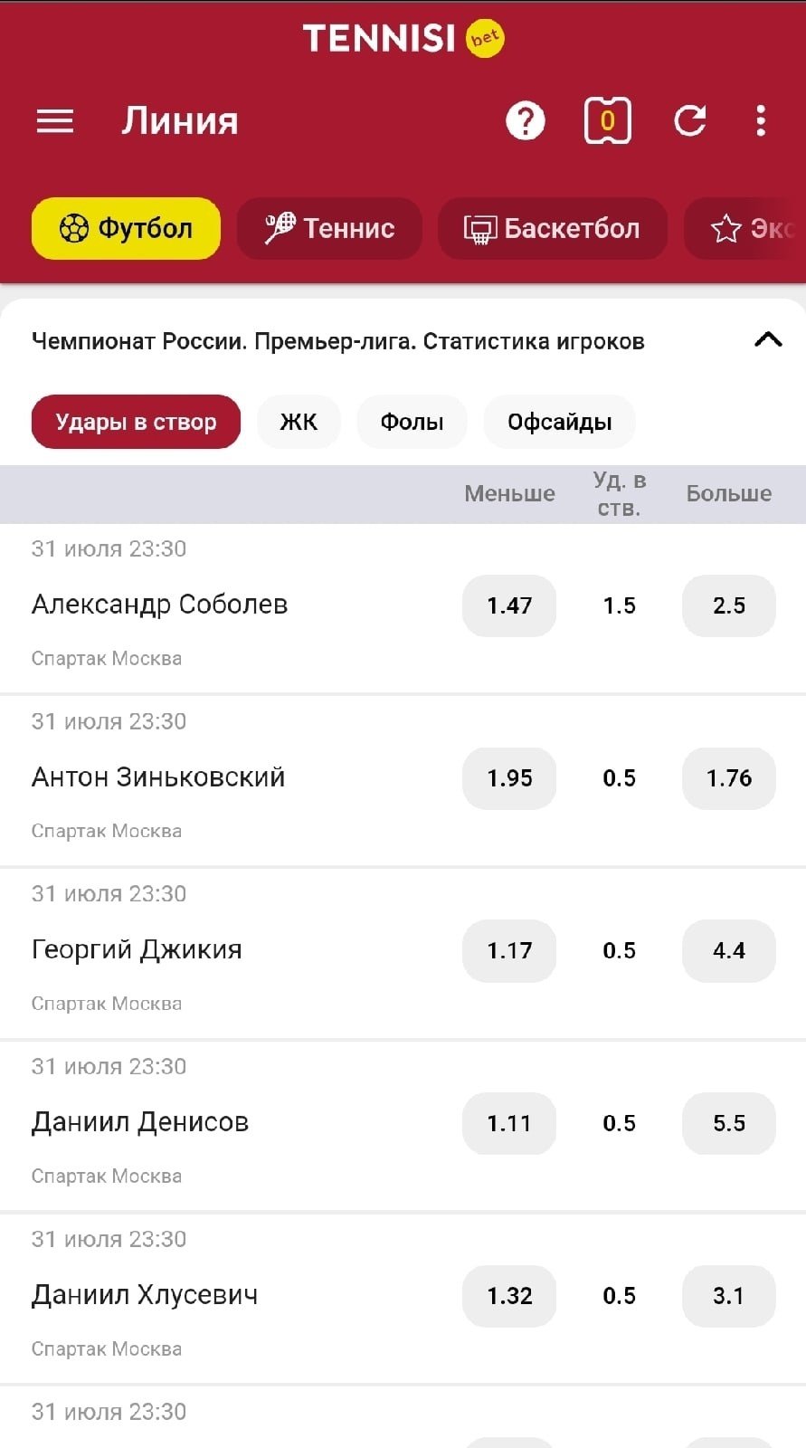 Большинство российских БК старается выкатывать подробную смоловую линию: в обязательной программе для матчей РПЛ не только угловые и карточки, но и более узкая статистика — удары, фолы, офсайды и ауты.