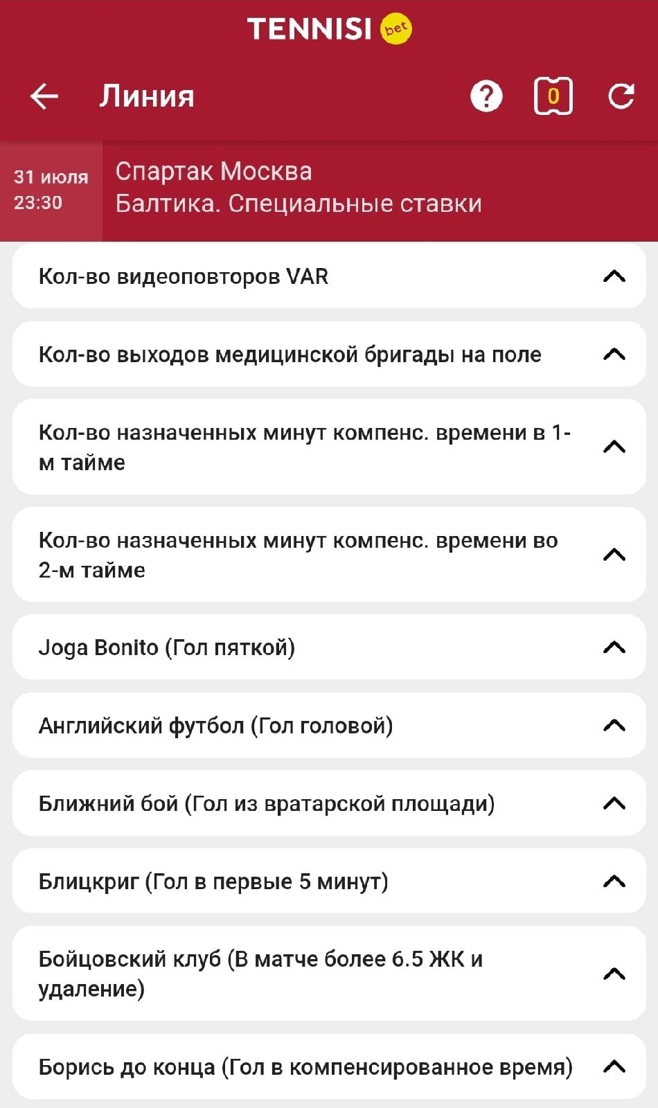 У букмекера крепкая смоловая линия: классические углы и карточки появляются за несколько дней до матча, а в день тура поставить дадут на офсайды, фолы, ауты, попадания в каркас ворот и вплоть до выхода на поле медицинской бригады.
