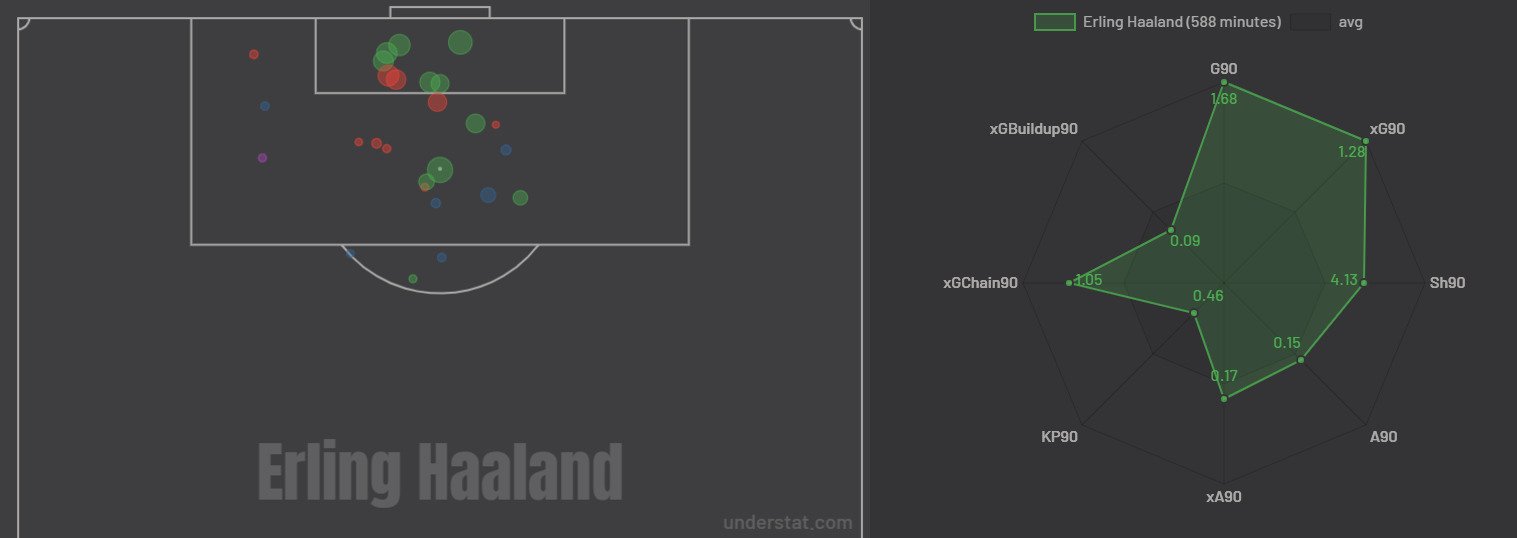 Форвард, которого так не хватало Пепу в прошлом сезоне, наконец-то есть, и оправдания по поводу очередного вылета из Лиги чемпионов больше не принимаются. Норвежец — идеальный наконечник атак и прессинг-машина. Его тепловая карта выглядит как квинтэссенция нападающего: не тянет на себя, красные зоны рядом со штрафной и центром поля (много бьёт и опасен у ворот соперника, работает в отборе во второй трети поля).