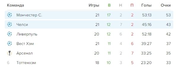 В турнирной таблице АПЛ соперники лидируют, опережая всех прочих. Правда, «Челси» отстаёт от «Сити» на 10 очков.