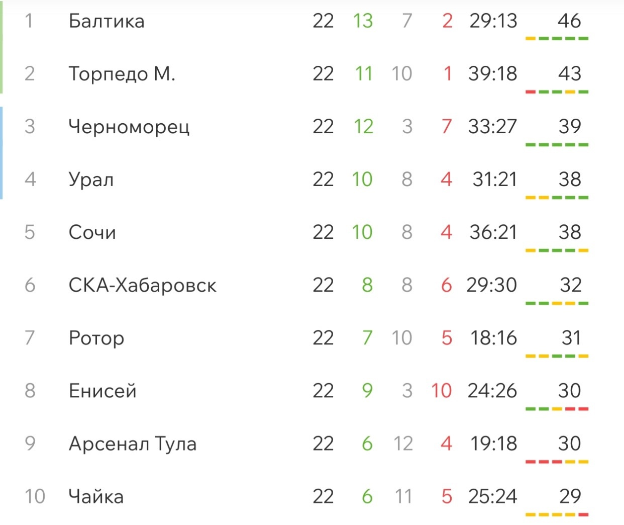На одно очко уже от «Черноморца» отстают «Урал» и «Сочи». Чуть тяжелее за стыки будет зацепиться амбициозному СКА и «Ротору» Бояринцева — Хабаровск в шести очках от четвёртого места, Волгоград в семи. Тем не менее мечта, или даже цель вернуться в РПЛ есть у обоих клубов. Так что в оставшихся турах борьба точно будет не хуже, чем год назад.