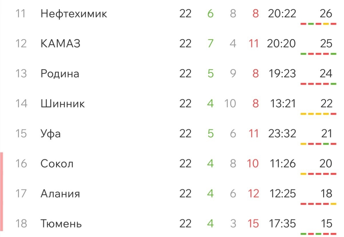 Ещё один претендент на вылет, «Сокол», неожиданно не проиграл в Сочи (0:0) и перед 23-м туром отстаёт от «Уфы» всего на балл. В целом же картина внизу таблицы выглядит так — между 11-м местом «Нефтехимика» и 16-м «Сокола» всего шесть очков (26 против 20), а теоретические шансы на сохранения прописки есть и у «Тюмени» с последнего места (15 баллов, много матчей с прямыми конкурентами). Жара будет во всех крайних точках таблицы — и после первого весеннего тура даже сложно сказать, где борьба будет плотнее и интереснее.