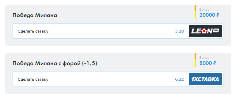 Предположим, что вместе с экспертом Legalbet Ровшаном Аскеровым вы поверили в перезагрузку «Милана» сразу после выхода итальянской Серии А с карантина. Опытные игроки делают ставки на победу одной из команд целыми сериями – это оптимизирует величину потенциального выигрыша, не причиняя существенного вреда общему банку (при разумных суммах ставок). Поэтому рассмотрим сразу три варианта пари на «Милан».