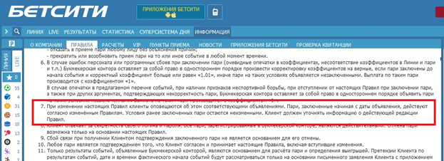 В этом вопросе всё однозначно. Никакие изменения в договоре не могут затрагивать ранее сделанные ставки. Это понимают и сами букмекеры. Практически во всех конторах есть упоминание о подобных случаях в правилах. Вот, например, как это выглядит в БЕТСИТИ: