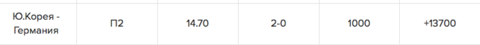 Ю.Корея - Германия | П2 | 14.70 | 2-0 | 1000 | +13700 |