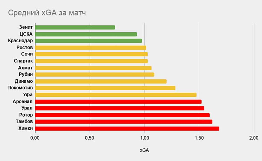 С обороной у российских команд проблемы — только у трёх клубов средний показатель по xGA меньше единицы: у «Зенита», ЦСКА и «Краснодара». Они же меньше всех пропустили в чемпионате после 19 туров.