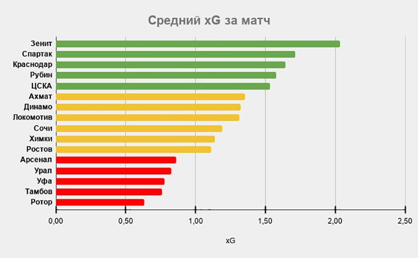 Всего пять клубов РПЛ имеют средний xG больше 1,5 голов за матч. Только у «Зенита» этот показатель составляет больше 2,0.