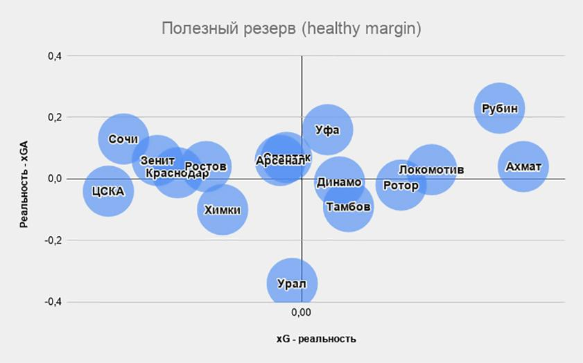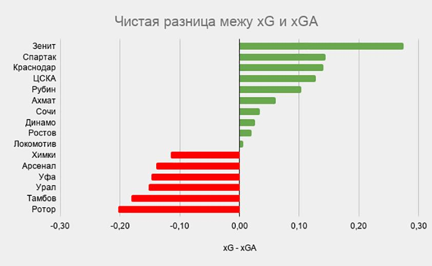 Один из фундаментальных графиков — разница между xG и xGA. Она показывает, с каким гандикапом по статистике ударов команда может выигрывать каждый матч.