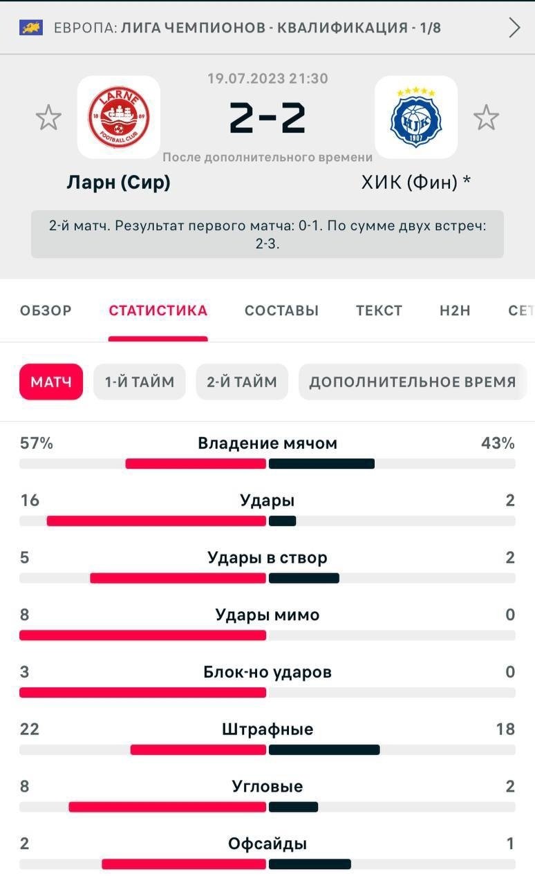 Ответка же снова оказалась полной противоположностью 1-й встрече. Инициатива перешла к североирландцам, а по всем важным показателям игроки «Ларна» не просто победили, а разгромили своих оппонентов из Финляндии. Взгляните на статистику 2-й игры!