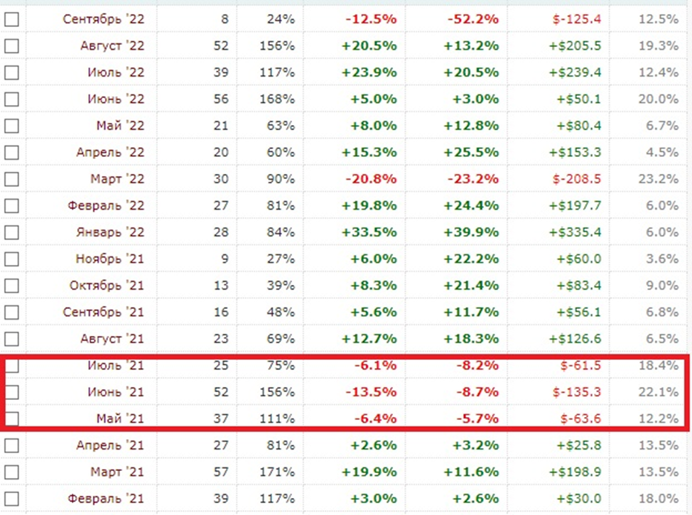 Переход на биг-маркеты ожидаемо получается непростым, бить линию здесь намного тяжелее. Пришли достаточно продолжительные просадки. Так, начиная с мая 2021 года, у меня было три минусовых месяца подряд. И это на фоне того, что до этого, с августа 2014-го, не было вообще минусовых месяцев. Конечно, продажи упали, и я понимаю своих клиентов. Многие из них, даже самые адекватные, думали, что в этой рассылке семь лет не было провалов, поэтому их тут никогда и не будет.