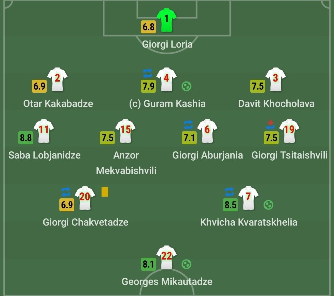 Во-первых, это решение коуча перейти на игру в три защитника. Схема чем-то похожа на датский вариант Евро-2020, только вместо латералей Васса и Меле отжигают Саба Лобжанидзе и Георгий Цитаишвили.