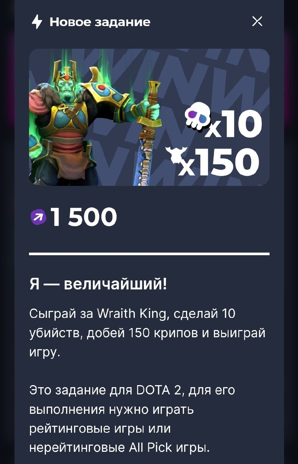 Отметим креатив конторы: задание, в котором нужно играть за Wraith King’а, называется «Я величайший!» — отсылок к Папичу много не бывает 😍