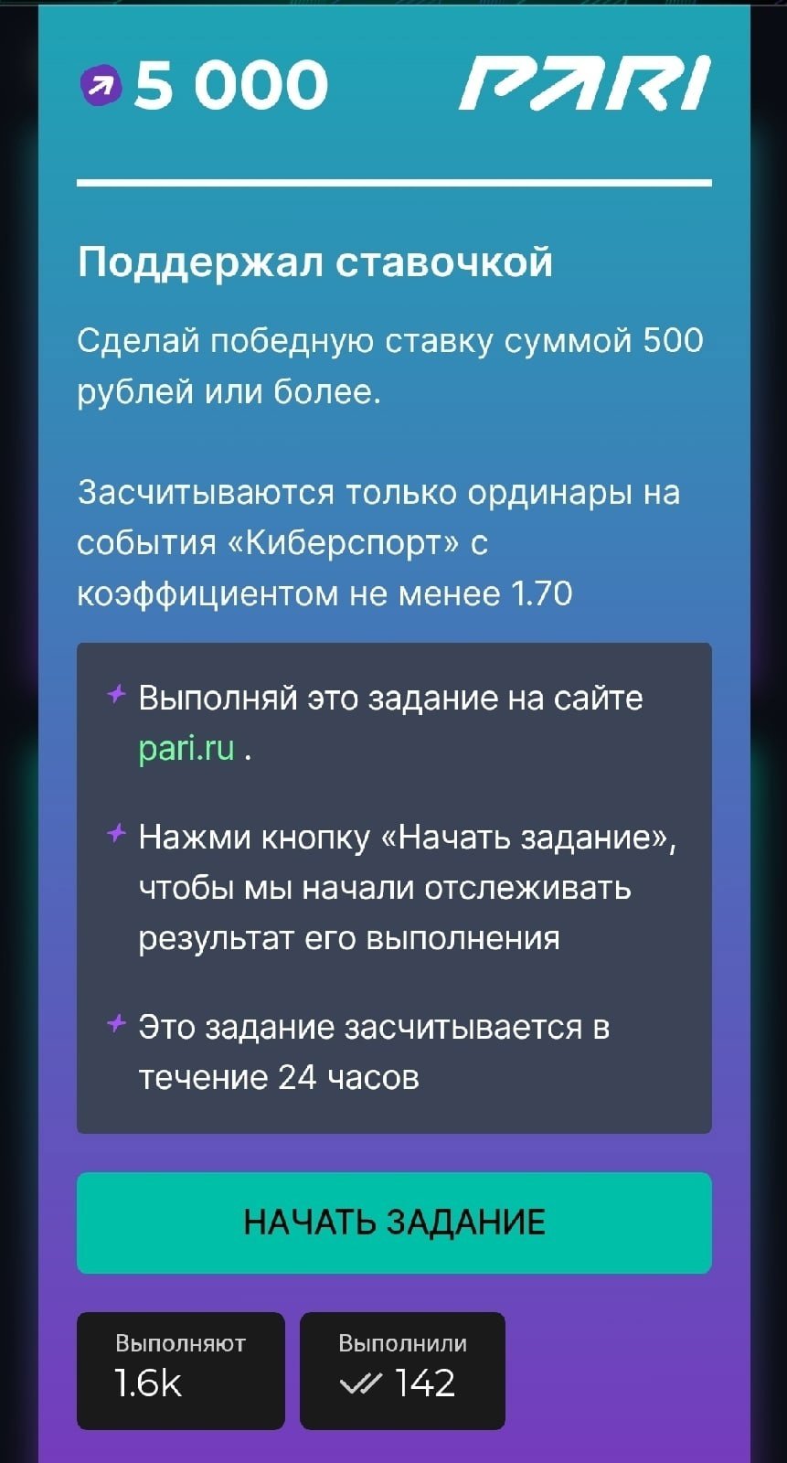 1. Чисто букмекерские. Сделай ставку, пополни баланс и тому подобное. При этом у заданий достаточно жёсткие условия: пари нужно заключать на киберспортивные события с кэфом от 1.70, а для получения коинов (местной валюты) ставка должна сыграть.