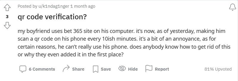 «Мой парень сидит на сайте bet365 через ПК, а со вчерашнего дня он сканирует QR-коды на своём телефоне каждые 10 минут. Это немного раздражает, потому что он не может использовать свой смартфон в других целях. Кто-нибудь знает, как от этого избавиться?»