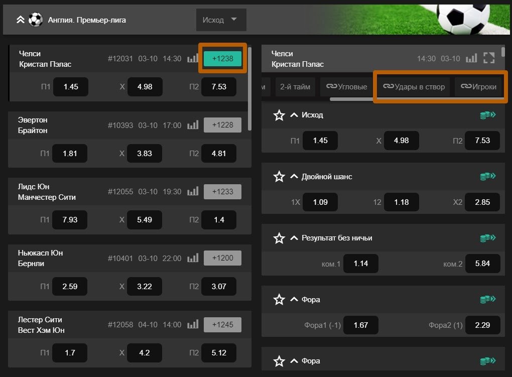 Роспись понравится прежде всего любителям топ-футбола. Более 1200 предложений по ставкам, рынки по ударам в створ ворот, фолам и офсайдам.