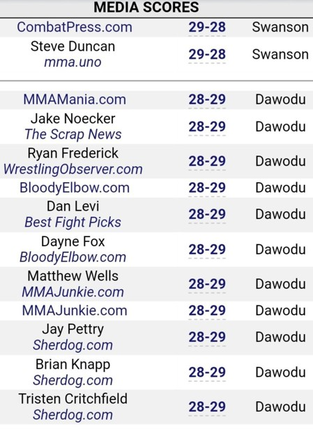 Непонятно, то ли от молодого бойца ожидали большего и наказали девятками, то ли сказалось то, что Свонсон нанёс на 2 удара в голову больше. Также Хаким проиграл по запискам последний отрезок, где уже однозначно перебил Каба как по статистике, так и по картинке, но пропустил тейкдаун, а такое, похоже, не прощается. С судьями UFC согласились ещё 2 эксперта из медиа, но 11 других были категорически против, отдав победу Даводу.